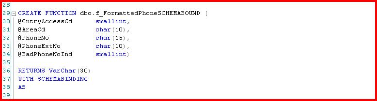 If you use TSQL UDF's (and you really shouldn't be in many cases), make sure you use WITH SCHEMABINDING. The performance improvement is STAGGERING. Let's look at an example. Here we have a typical scalar UDF, it takes a series of inputs and nicely formats a telephone number. Very simple.