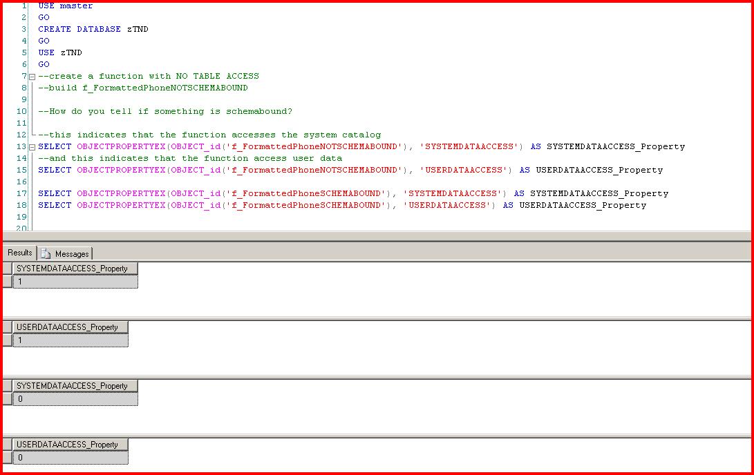 For the demo I have 2 versions of this function...one WITH SCHEMABINDING and one without. Here is the demo file. And here are the functions I will use for the demo.