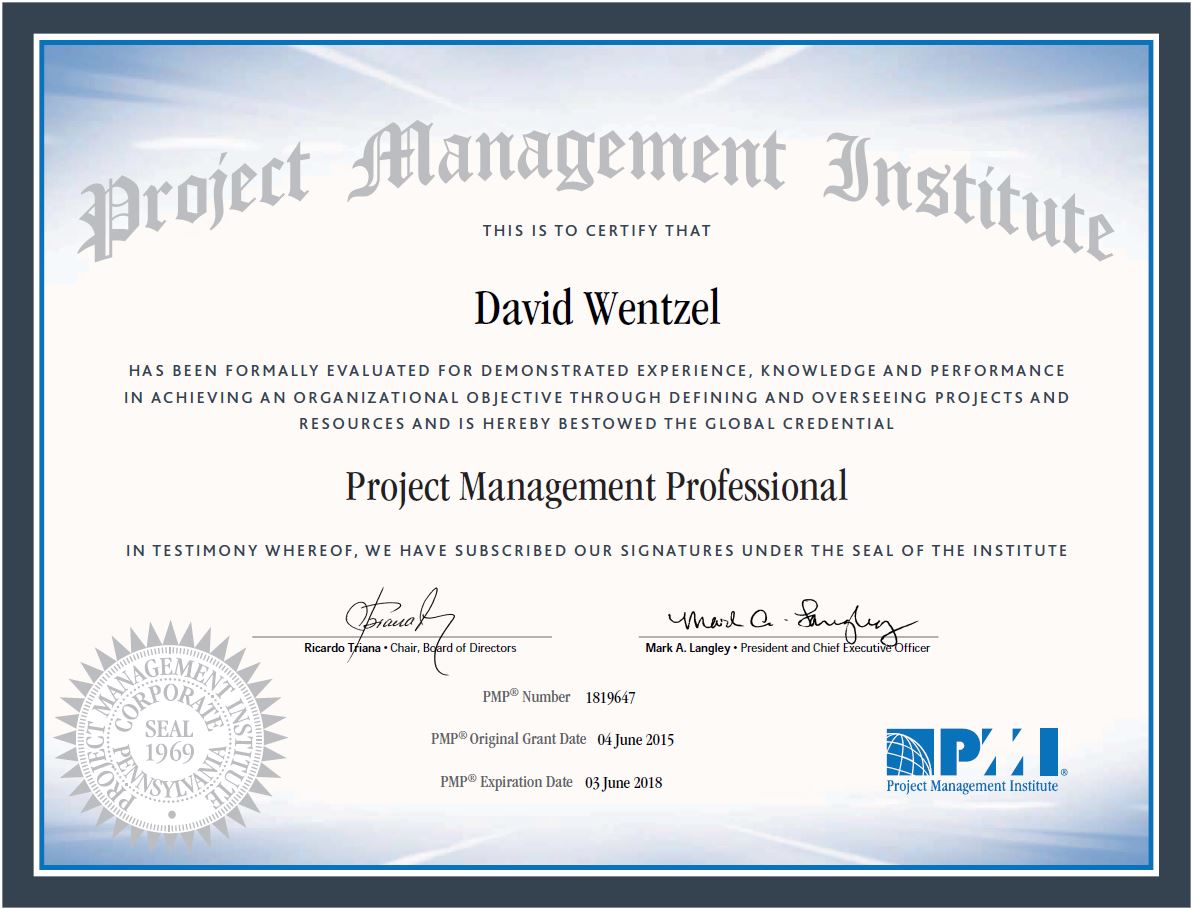 I am happy to say that I passed my PMP certification exam on my first try.   This is not an easy test and it focuses on trick questions that have very little real-world practicality.  That complaint aside, you do learn the important, underlying project management themes.  It is a good industry certification that I recommend.